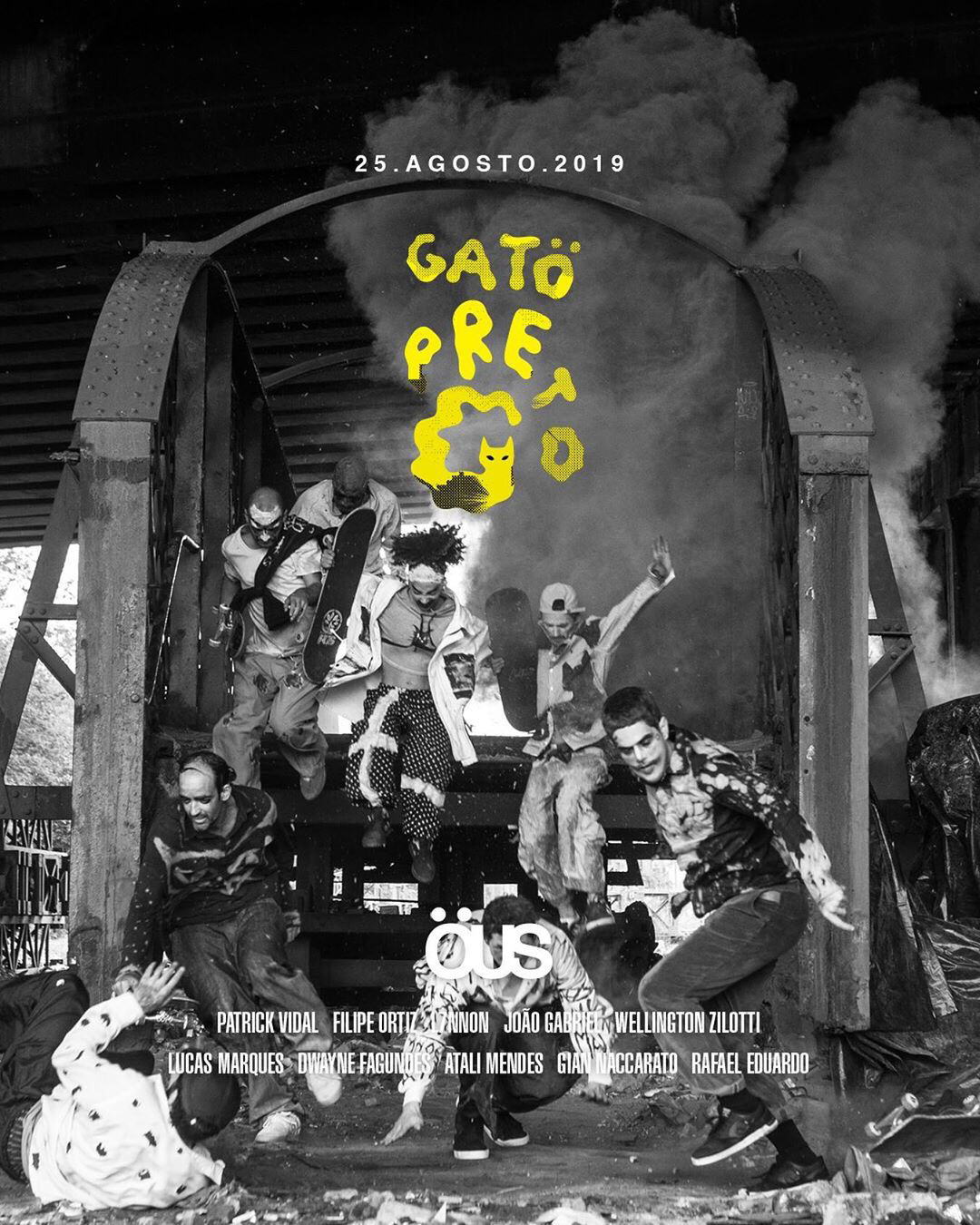 Illustrations and visual identity for the Brazilian skate brand ÖUS, created for the launch of their new "Gato Preto" ("Black Cat") clothing and shoe collection, as well as their first skate film.