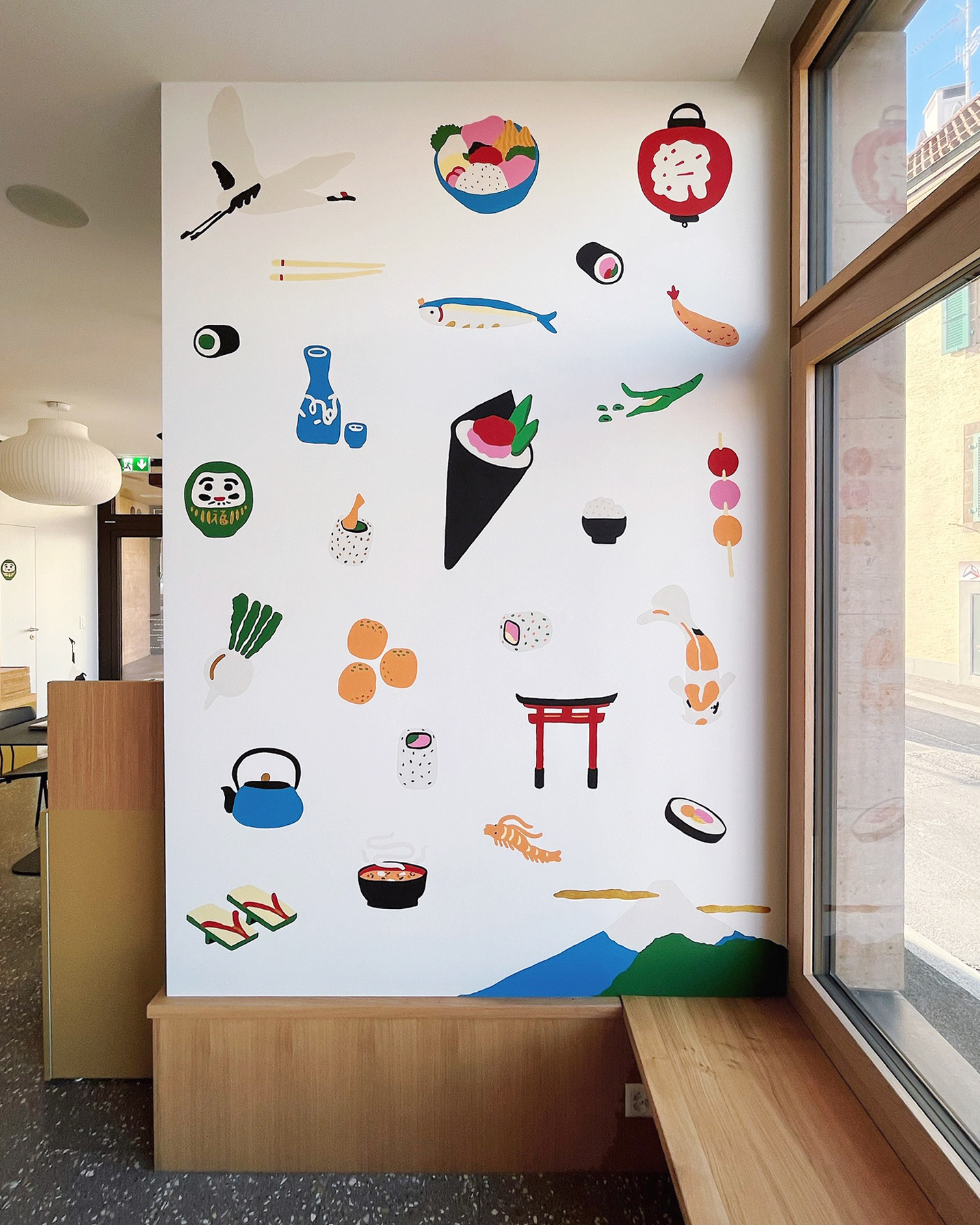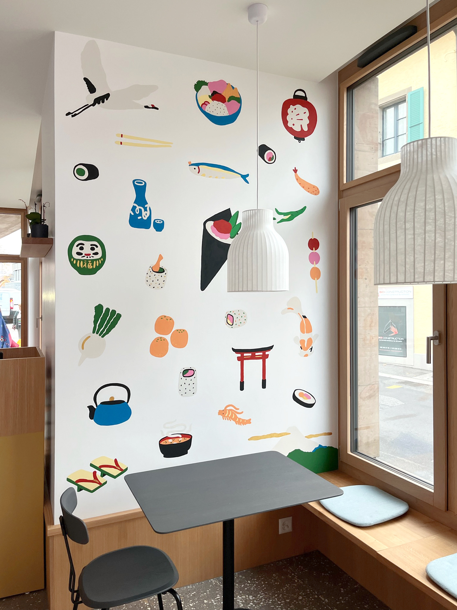 Wall fresco created for the Japanese restaurant Temaki Bar by Kakinuma in Vésenaz, Geneva.